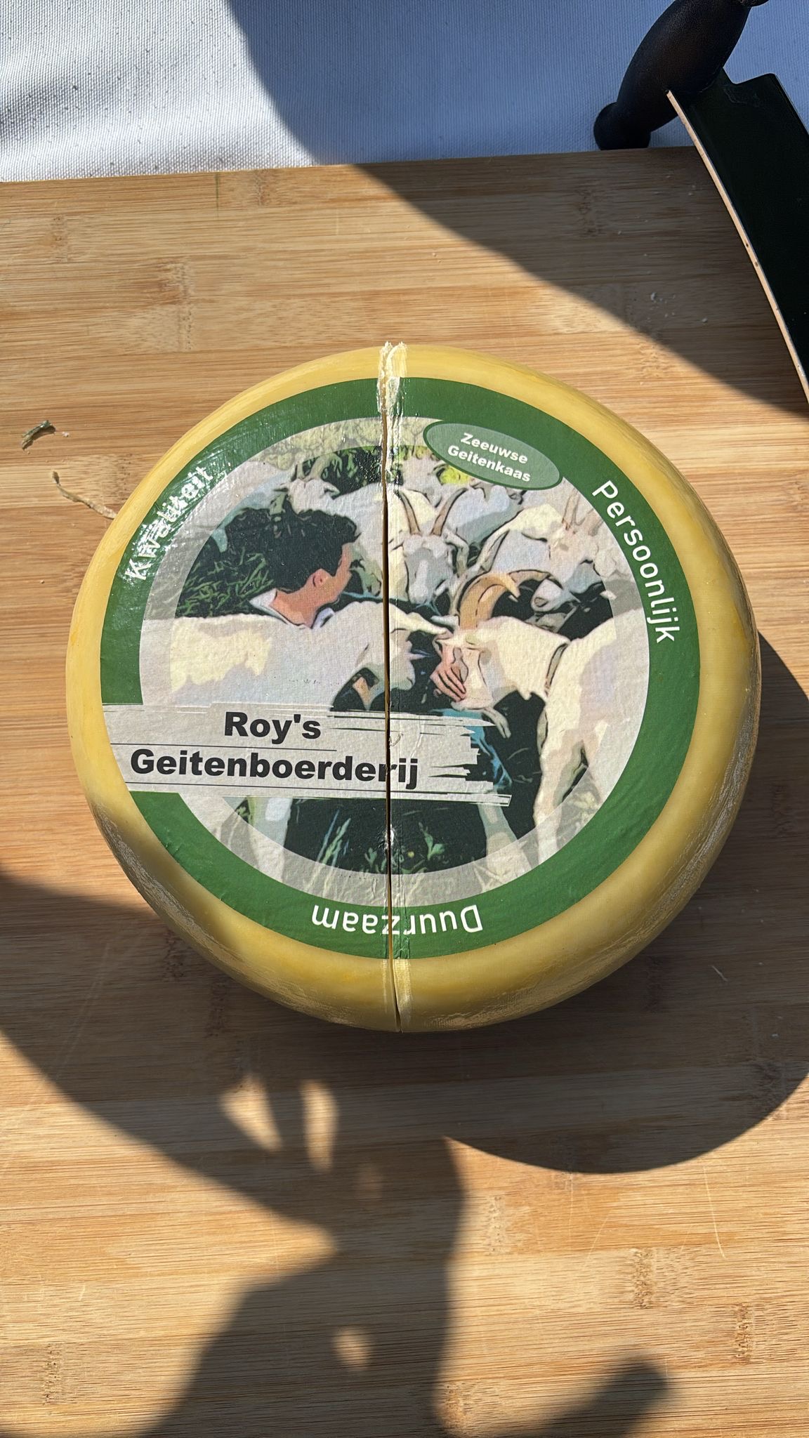Traas maakt het nieuwe merk officieel bekend. De rode theedoek gaat van de ronde bol geitenkaas en Traas laat het aanwezige publiek het nieuwe merk zien. Een woord beeld merk. kenmerkend met de geitenboer omringd door geiten in het groene gras. Rechts onder staat de merknaam. Daaromheen staan de drie kernwaliteiten ‘ Roy’s Geitenboerderij, peroonljk- duurzaam- en kwaliteit ‘ , verteld Traas. Even opletten waar ik snij, want anders snij ik midden door z’n hoofd’, grapt Traas. , waarna ze vervolgens op ceremoniële wijze de kaas doorsnijd.