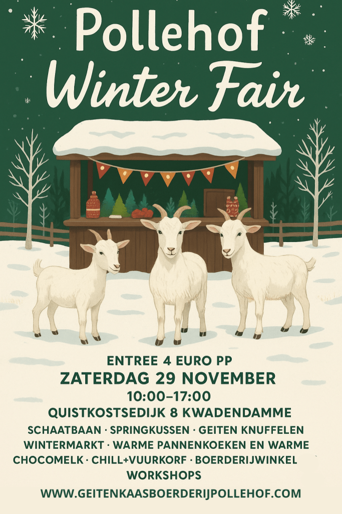 We nodigen je van harte uit om samen met ons de winter te komen vieren op ons erf. Tijdens de Winterfair vind je bij ons een knusse wintermarkt, een schaatsbaantje voor de kinderen, een springkussen, kleine workshops, en natuurlijk kun je onze geiten komen knuffelen 🐐✨