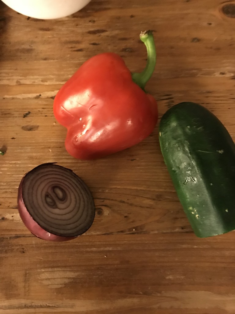 Snijd de komkommer in de lente en verwijder de zaadlijsten. Snijd de tomaten in vieren en verwijder de zaadlijsten. (De zaad lijsten kun je gebruiken in bijvoorbeeld pasta sauzen). Snijd de komkommer en tomaten in stukjes van 1/2 centimeter. Was de sla en snijd de olijven in dunne ringen. Doe alles in een mengkom.