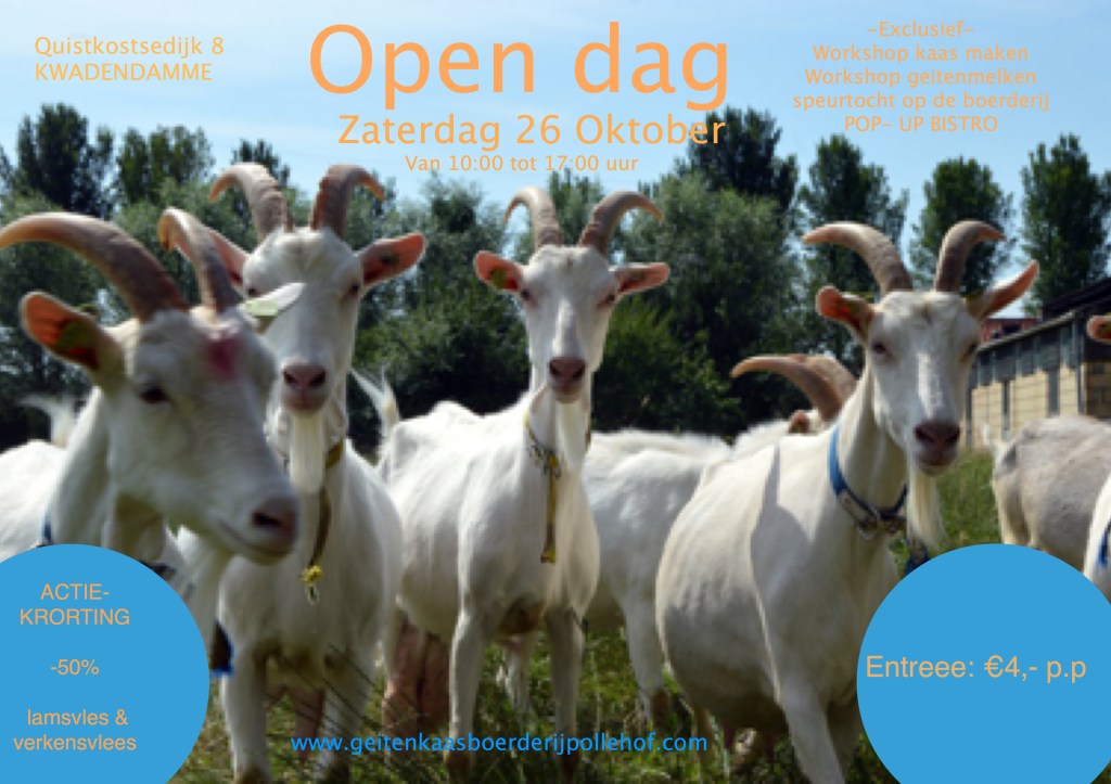 Kom je ook? Want we hebben voor jullie een super toffe dag. Aan het einde van de herfstvakantie op zaterdag 26 oktober openen we deze dag de deuren van onze geitenkaasboerderij en zorgboerderij. Je kunt een kijkje nemen in de stal, kaasmakerij, boerderijwinkel. speciaal voor deze dag is een pop up bistro, workshop kaasmaken, workshop geiten melken, rondleiding op het erf en een speurtocht.